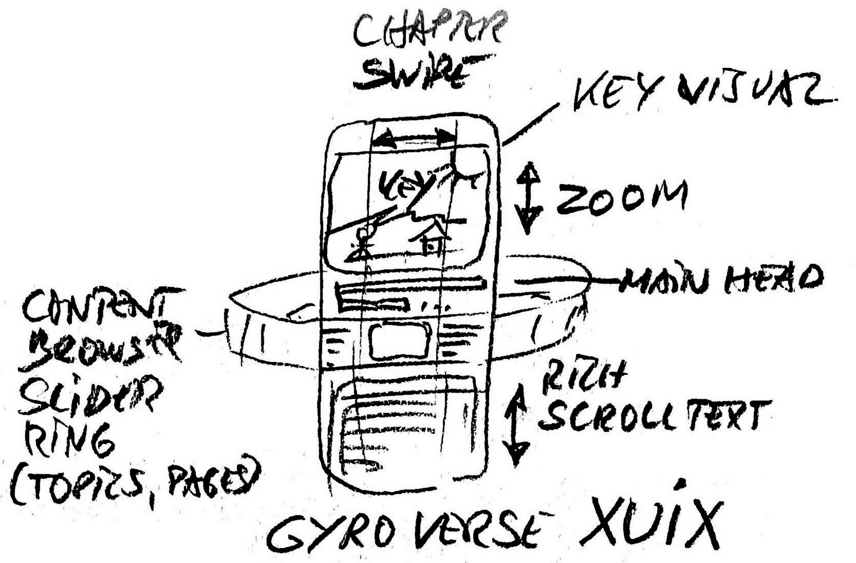 A horizontal content browser slider ring for topics and pages to zoom in and scroll into rich text including using the gyroscope to enter a «Gyroverse».